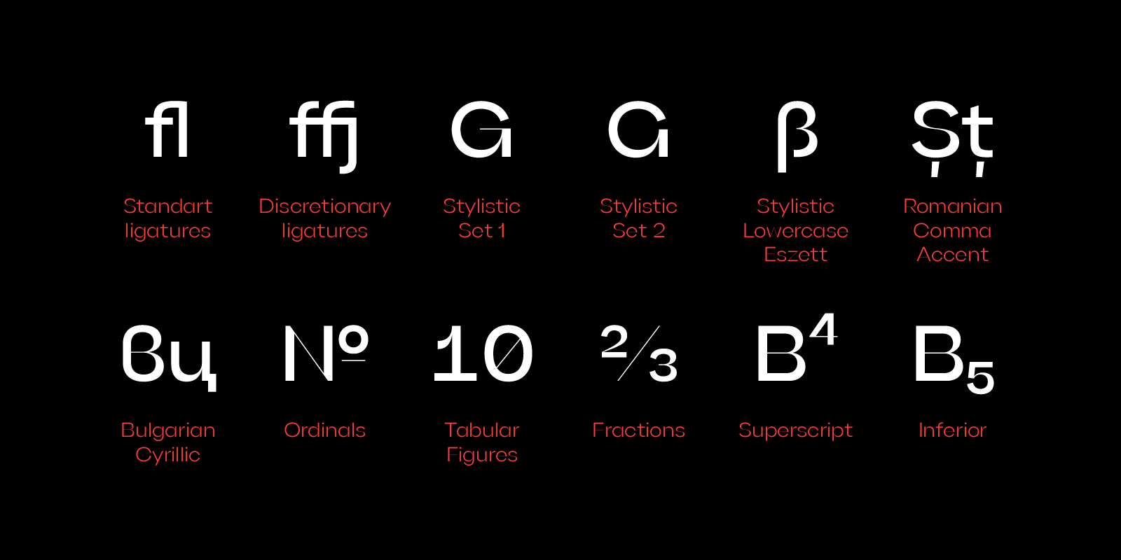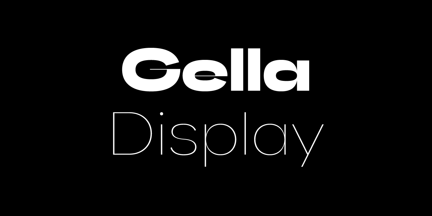Gella Display is a sans serif display typeface family with internal high contrast. It consists of 40 styles (10 weights × 4 widths). The multitude of styles makes Gella Display a versatile typeface, suitable for both large blocks of text and for headlines, logos, packaging, branding, presentations, and more. Gella Display supports Latin and Cyrillic scripts, and includes various OpenType features such as ligatures, stylistic alternates, fractions, and others.
