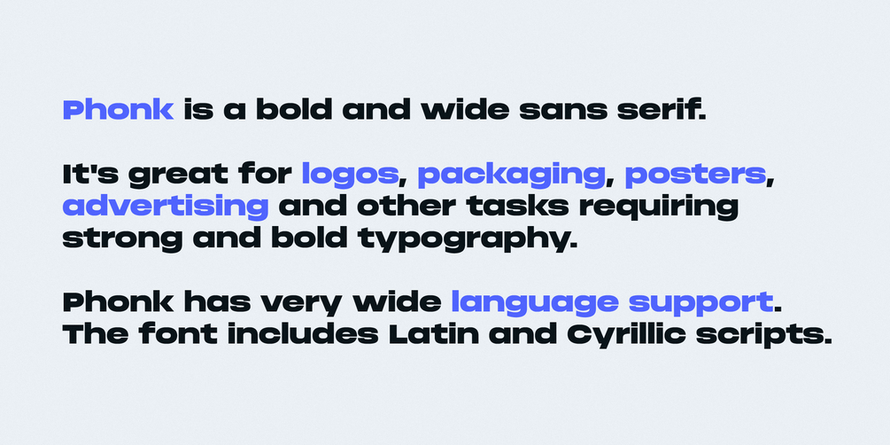 Phonk is a contemporary sans serif typeface with a bold, wide appearance and a distinctive character. Supporting multiple Latin and Cyrillic scripts, Phonk is versatile and ideal for headlines, logos, packaging, posters, advertising, and other applications requiring a strong and confident typographic presence.