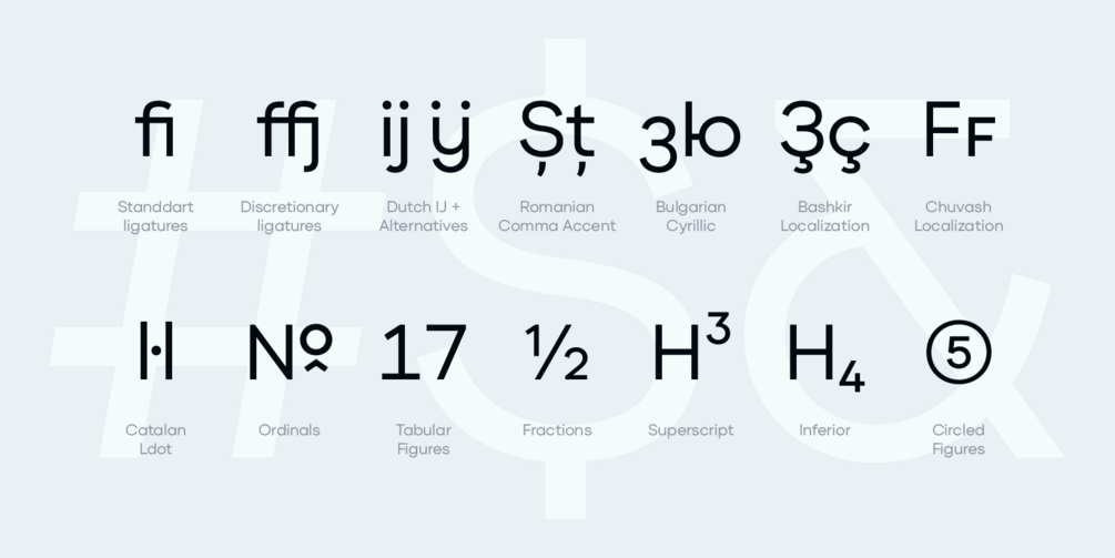 Qilljoy supports Latin and Cyrillic, has various OpenType features such as ligatures, alternate glyphs, fractional numbers and others.