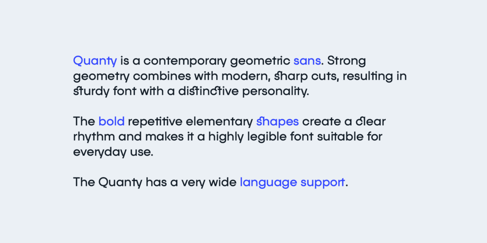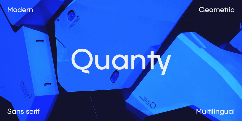 Quanty is a modern sans serif typeface characterized by its uncompromising geometric shapes, fresh and clean design, and unique visual identity. Supporting multiple Latin and Cyrillic scripts, and offering a wide range of typographic features, Quanty is versatile and ideal for headlines, logos, branding, sites, presentations, and more.
